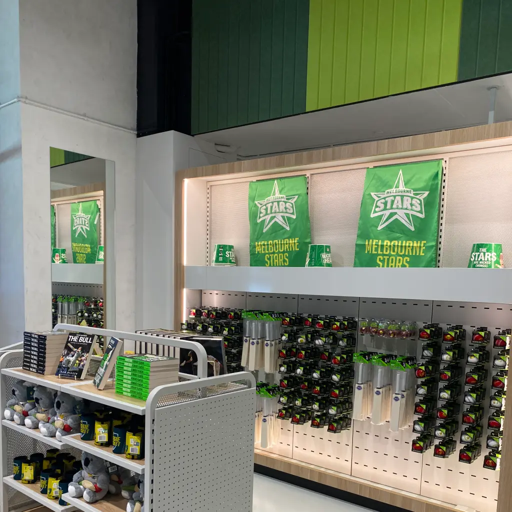 PE Australia rose to the occasion by implementing a streamlined workflow specifically tailored for the MCG Shop project. Our team prioritised efficient powder coating for all shop fixtures and fittings, ensuring a rapid turnaround time without compromising on quality. Through meticulous scheduling, optimised production processes, and open communication with Greater Group, we were able to deliver the powder-coated elements within the designated timeframe. This allowed for seamless installation and ensured the MCG Shop reopened on schedule, ready to deliver a premium shopping experience to Melbourne Cricket Ground fans.